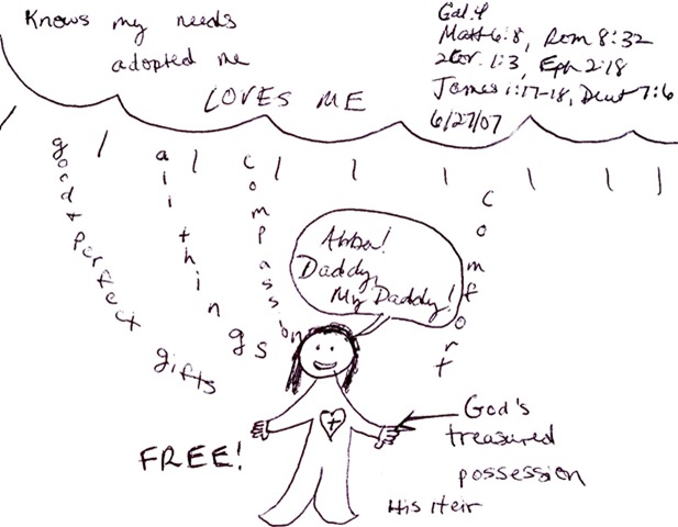 I have the best Daddy in the universe! He's not my natural Daddy...no, He adopted me, rescued me from a life of slavery and is taking me home with Him. He already seems to know me more than I know myself, and He accepts me and loves me just as I am anyway! He knows what I need before I even say a word about it. His gifts are wonderful - they are perfect and good! He meets every one of my needs. When I'm hurt, frustrated, or upset, He's there for me, giving me the comfort and compassion I need. His love for me is so great...He calls me His treasured possession and tells me I am the heir to all He has. I can hardly imagine that. I can only cry out to Him, "Abba, Father!" or "Daddy, my Daddy!" He's the best Daddy there ever could be.