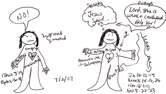 The contrast between the woman who is saying "No!" to God and "Yes" to sin and the woman who is allowing the Spirit to work in her life is striking. The Spirit is still in the life of the Christian who has allowed sin to get a foothold in her life, but it is grieved. And because she is rejecting God's will, the Spirit is also being quenched. She will not allow the Spirit to do it's work in her - to fill her up. She probably is feeling empty, lonely, and sad but can't figure out why.